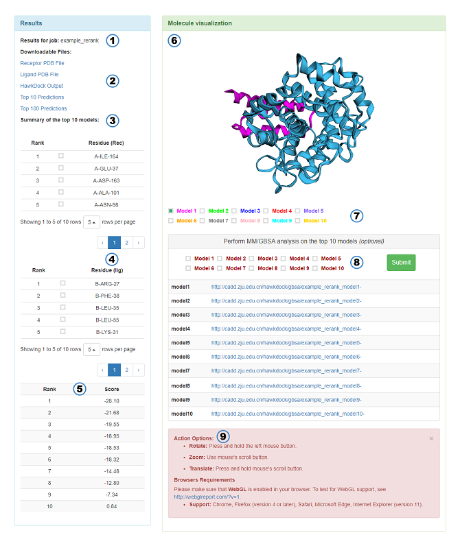 Re-rank top10 models by MM/GBSA : MM/GBSA has a better re-ranking capability. However, it takes much longer than the default settings and thus only top 10 models are supported now. In addtion, the key residues of the top 10 models will also be shown. Notice: Since all protein residues will be renumberd from 1 by HawkDock, the top 10 key residues number may be different from the original PDB. Besides, the chain ID of receptor and ligand will be set to A and B by HawkDock, respectively.